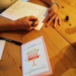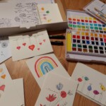 Und nach dem geistlichen Teil werden die Farben, Aquarellkästen, Karten und Stifte ausgepackt. Lea führt uns jeden Abend etwas weiter in die Technik des Malens und Schreibens ein, versorgt uns mit Ideen und Material und es macht uns allen Spaß, zu üben und zu experimentieren. Schon nach kurzer Zeit sind die ersten schönen Karten entstanden, wie ihr auch auf den Bildern sehen könnt.