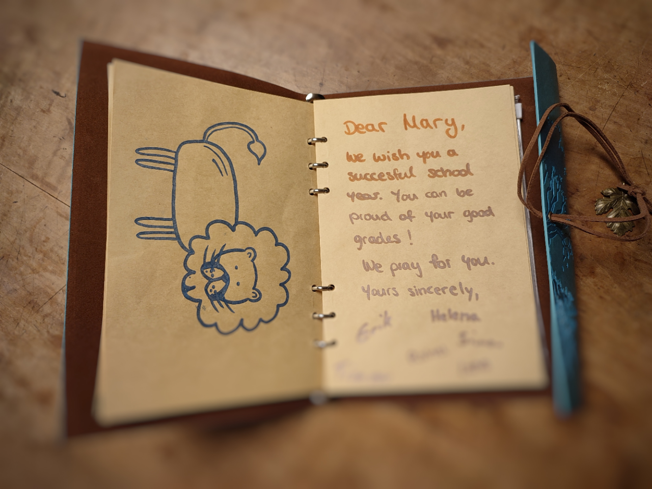 Besonders herzlich haben wir unser Patenkind Mary aus Sambia in den Gottesdienst integriert. Es war schön, den anderen Gottesdienstbesucher/innen zu zeigen, wie und wo Mary lebt und zur Schule geht. Das Notizbuch mit einem gemeinsamen Gruppenbilder und persönlichen Grüße der Gemeinde, soll Mary als ein besonderes Geschenk zugesendet werden.